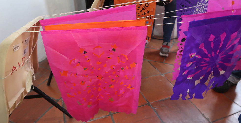 Yuriria Independencia Torres, artesana del taller "Papel picado Xochimilco", tuvo un encuentro con estudiantes del Taller de Artes Populares de la profesora Mariana Trejo Pereyra, en el que mostró a las y los estudiantes la forma artesanal de picar el papel de china para la festividad del Día de muertos. La actividad se efectuó este 20 de octubre en el Centro Cultural Casa Talavera. Acompañó a la tallerista Yesica Jaimes, enlace de Difusión Cultural y Extensión Universitaria en el plantel Centro Histórico.